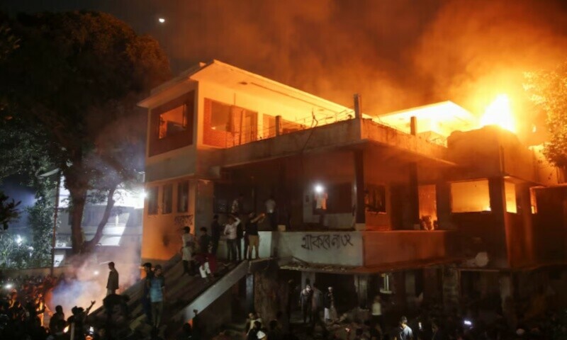 أشعل آلاف المتظاهرين النار في منزل الزعيم المؤسس لبنغلاديش، بينما ألقت ابنته، رئيسة الوزراء السابقة المخلوعة الشيخة حسينة، خطابًا حماسيًا على وسائل التواصل الاجتماعي دعت فيه أنصارها إلى الوقوف في وجه الحكومة الانتقالية