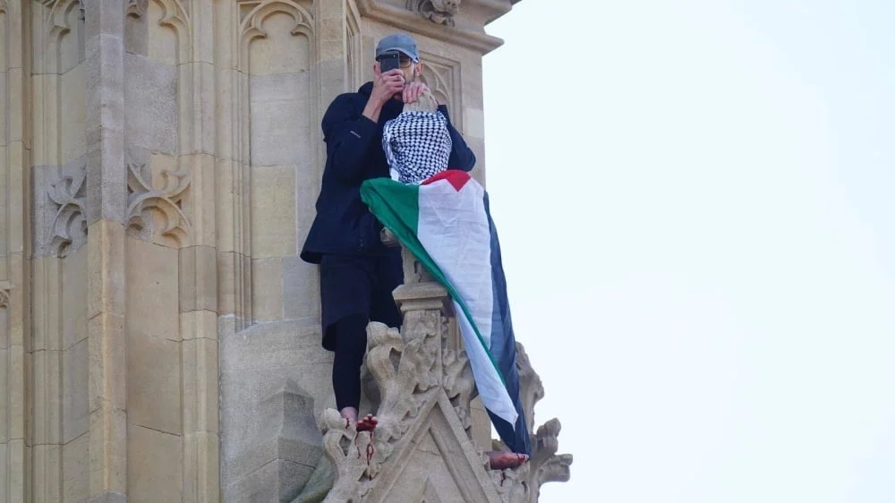 أفادت الشرطة البريطانية بأنه تم استدعاء خدمات الطوارئ إلى قصر ويستمنستر في لندن اليوم السبت، بعدما تسلق رجل يحمل علم فلسطين برج بيغ بن