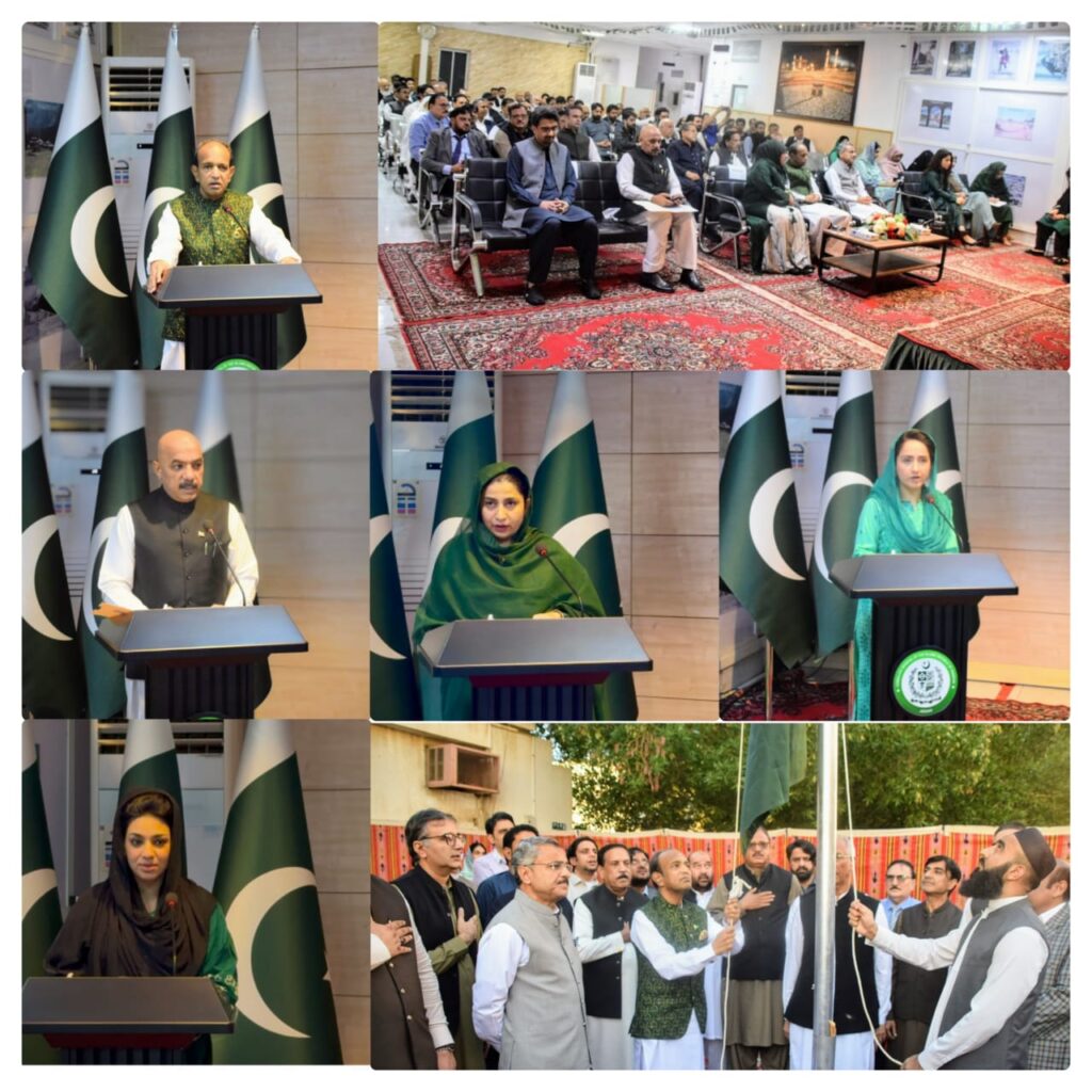 تم رفع العلم الوطني في قنصلية باكستان العامة في جدة، بينما كان النشيد الوطني يُعزف في الخلفية بحضور عدد كبير من أفراد الجالية. وفي كلمته بهذه المناسبة، سلط القنصل العام الباكستاني في جدة، خالد مجيد، الضوء على أهمية هذا اليوم وتحدث عن الروابط القوية بين باكستان والسعودية، واصفاً إياها بعلاقة أخوية متجذرة في التاريخ.