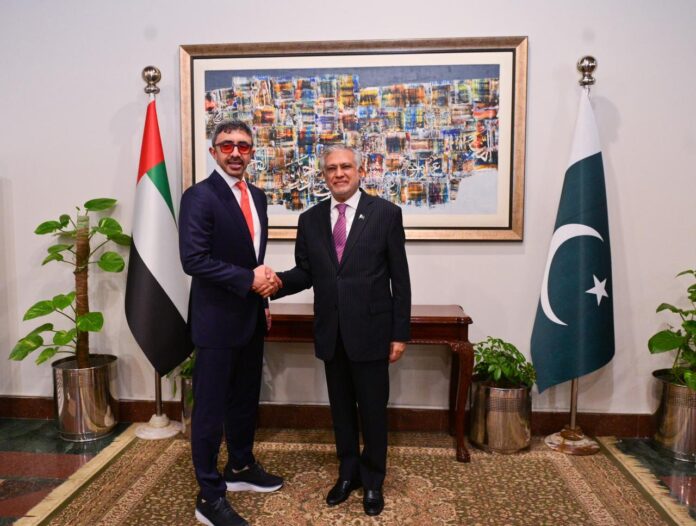 وفي كلمة سابقة أثناء ترحيبه بنائب رئيس الوزراء ووزير الخارجية الإماراتي في وزارة الخارجية، قال نائب رئيس الوزراء إسحاق دار إن البلدين تربطهما علاقة أخوية عمرها عقود قائمة على التزامات مشتركة ومحبة ومودة