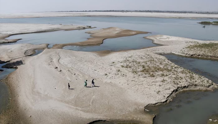 يمشي أشخاص على جزء جاف من نهر السند، في جامشورو، باكستان، 15 مارس 2025. — رويترز