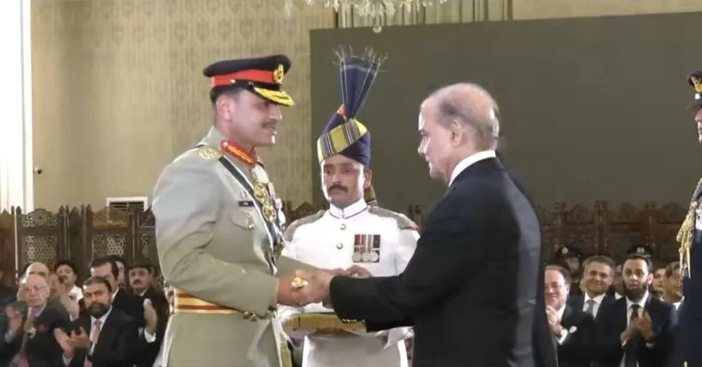 وحضر الحفل كل من رئيس الوزراء شهباز شريف، وأعضاء من مجلس الوزراء الاتحادي، ورئيس الوزراء الأسبق نواز شريف، ورئيس حزب الشعب الباكستاني بلاول بوتو، إضافة إلى حكام ورؤساء وزراء جميع الأقاليم، وعدد من السفراء والدبلوماسيين من دول مختلفة وقام الرئيس آصف علي زرداري ورئيس الوزراء شهباز شريف بمنح “عصا المشير الميداني” رسميًا للجنرال منير، تقديرًا لقيادته الاستراتيجية ومساهماته في الدفاع الوطني