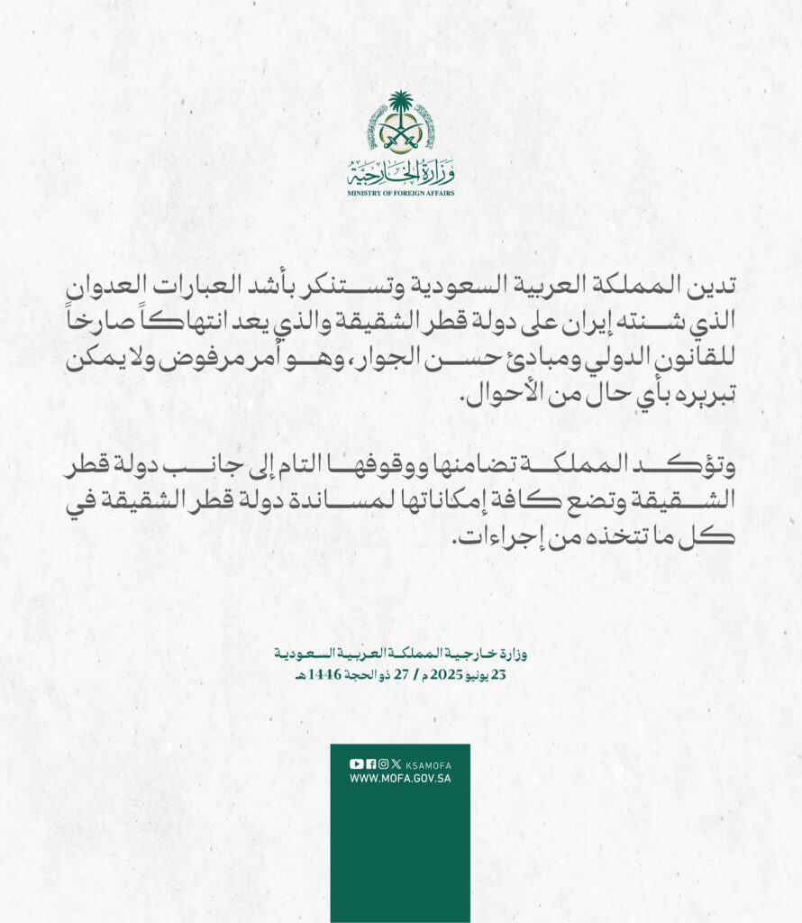 تدين المملكة العربية السعودية وتستنكر بأشد العبارات العدوان الذي شنته إيران على دولة قطر الشقيقة والذي يعد انتهاكاً صارخاً للقانون الدولي ومبادئ حسن الجوار، وهو أمر مرفوض ولا يمكن تبريره بأي حال من الأحوال