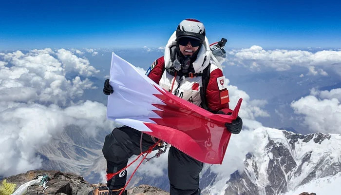 الشيخة أسماء آل ثاني، إحدى أفراد العائلة المالكة القطرية، تلتقط صورة مع العلم القطري على قمة نانغا باربات في هذه المناسبة.