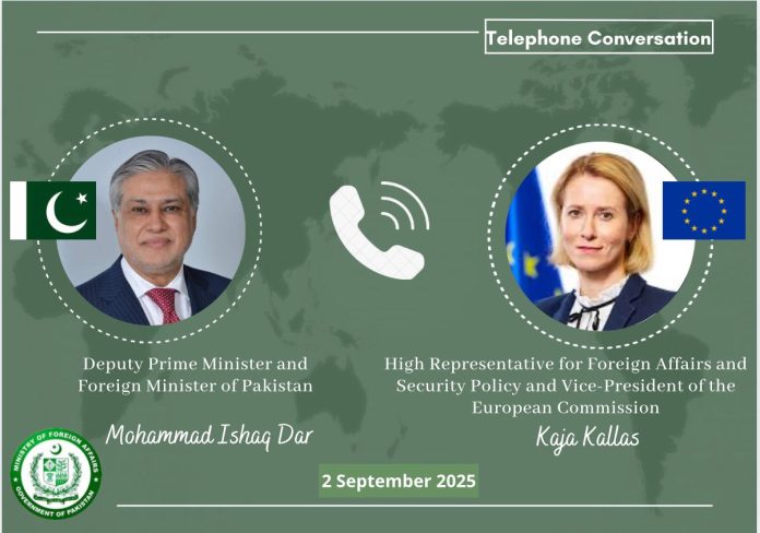 تلقى نائب رئيس الوزراء ووزير الخارجية، السناتور محمد إسحاق دار، يوم الثلاثاء، اتصالًا من الممثلة العليا للاتحاد الأوروبي/نائبة الرئيس كايا كالاس