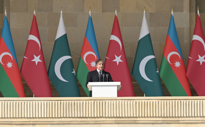 رئيس الوزراء محمد شهباز شريف جدّد يوم السبت تأكيده أن باكستان، مثل أشقائها في أذربيجان وتركيا، تسعى إلى السلام، لكن لا شكّ في أن أحدًا لن يُسمح له بتحدّي سيادتنا أو المساس بسلامة أراضينا.