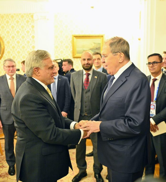 التقى نائب رئيس الوزراء ووزير الخارجية، السيناتور محمد إسحاق دار، بوزير الخارجية الروسي سيرغي لافروف، حيث استعرض الجانبان كامل نطاق العلاقات الثنائية وأعربا عن رضاهما العميق لمسارها الإيجابي الحالي.