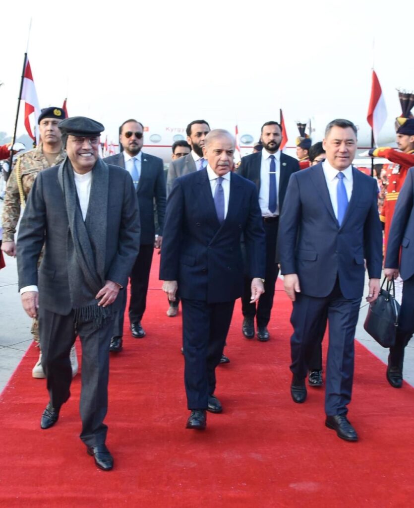 وعند خروج الرئيس القيرغيزي من طائرته الخاصة في قاعدة نور خان الجوية، كان الرئيس آصف علي زرداري ورئيس الوزراء محمد شهباز شريف في استقباله بحرارة.